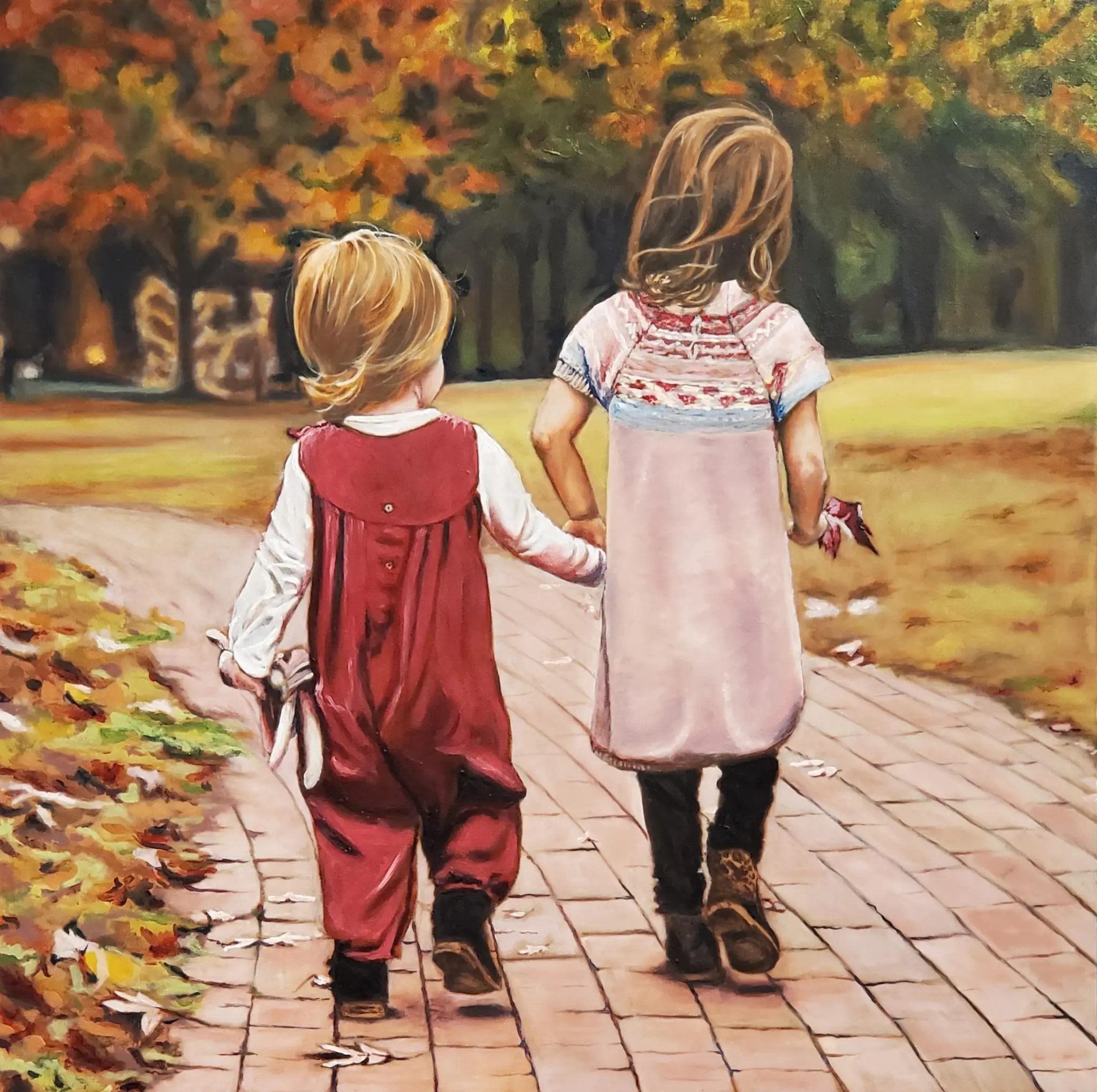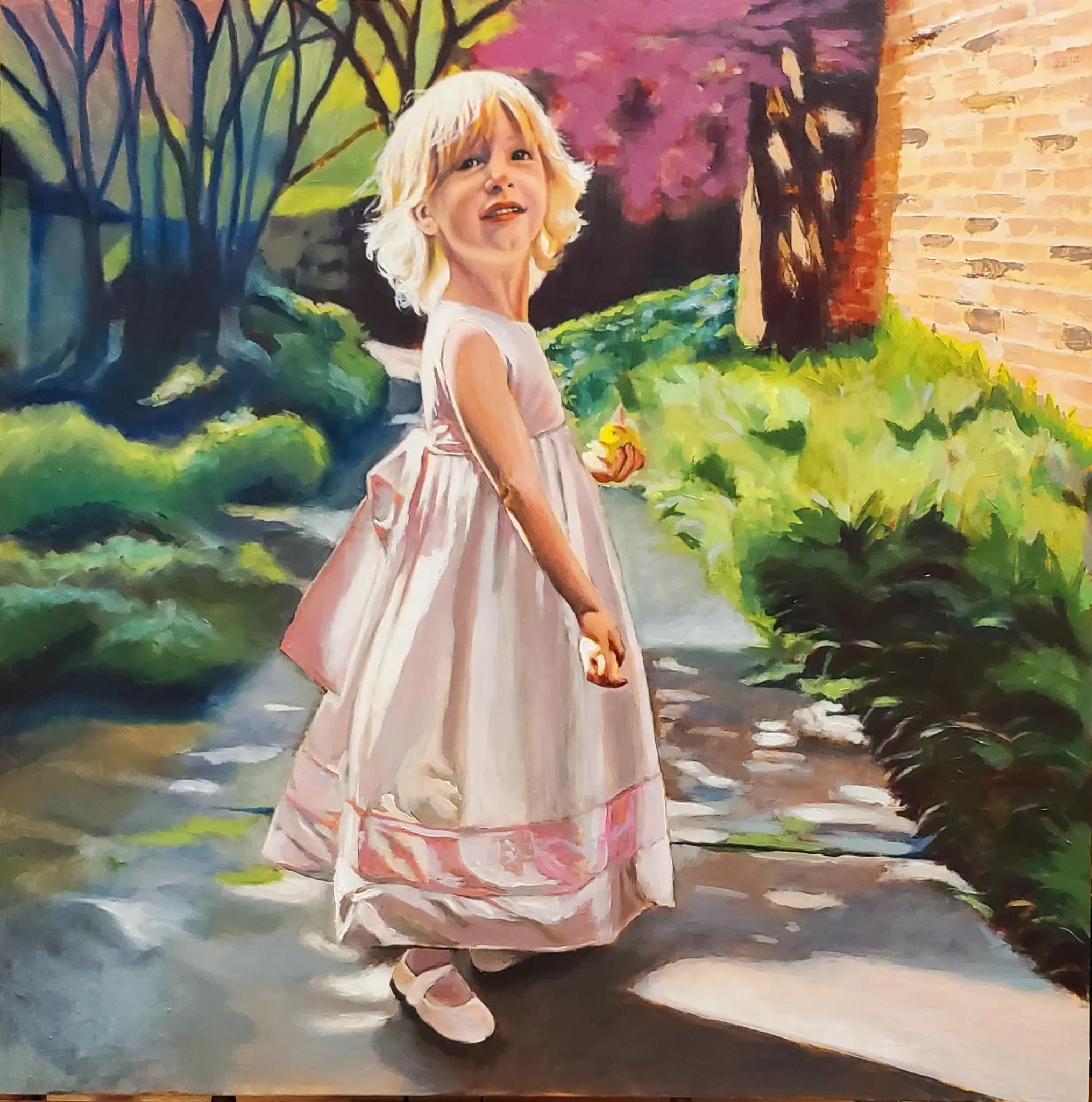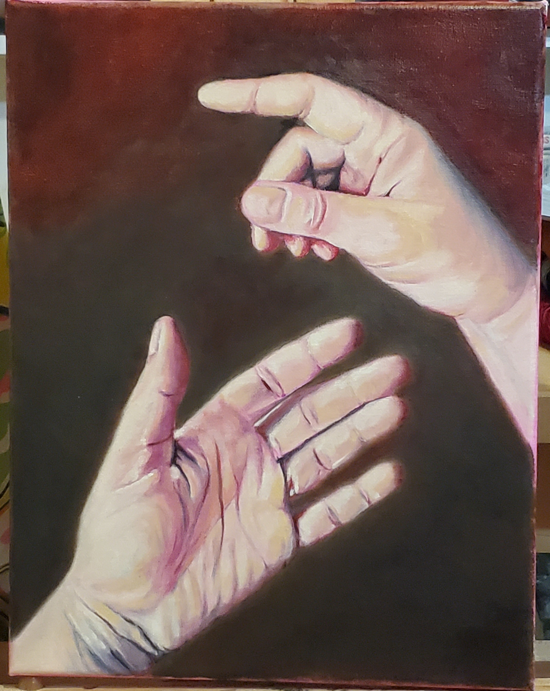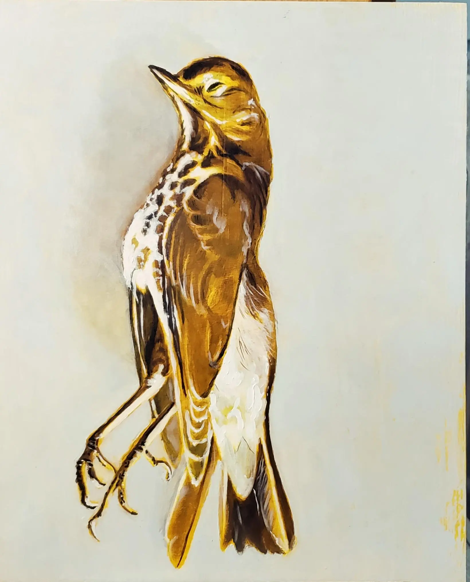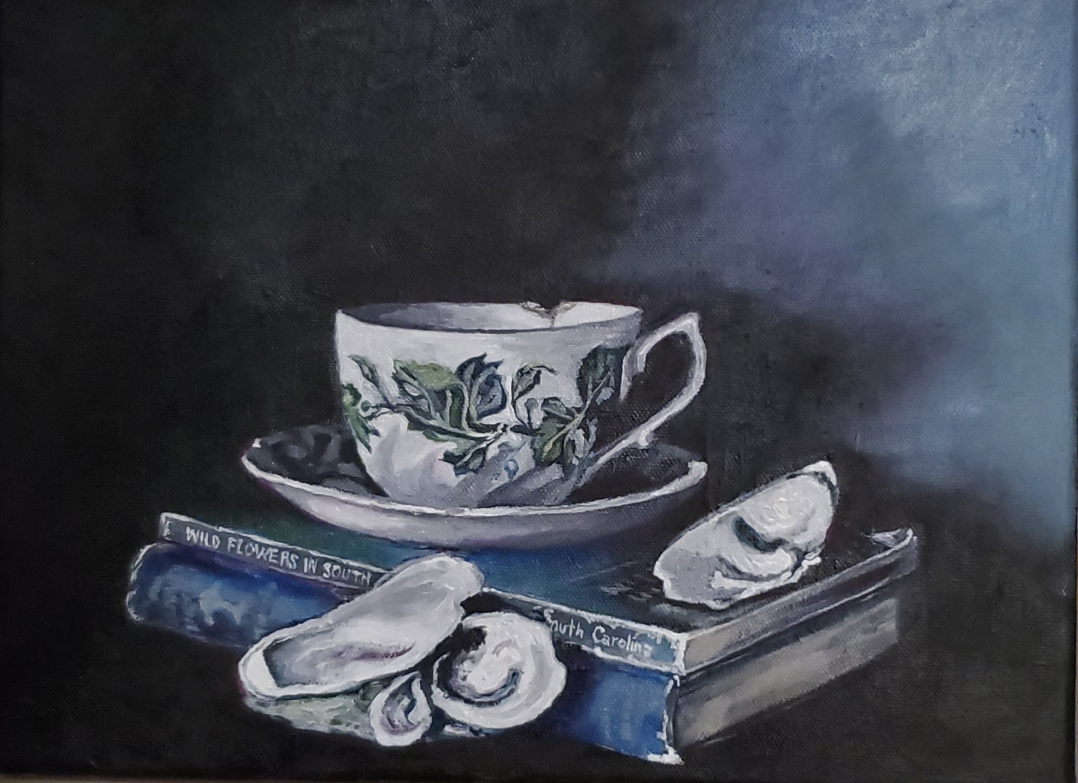 Working primarily in oils, Corey employs methodical layering of thin, transparent paint glaze over underpaintings, often following a grisaille stage to establish values, creating depth and luminosity.